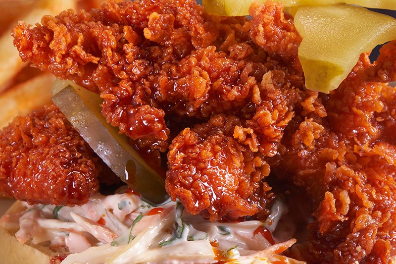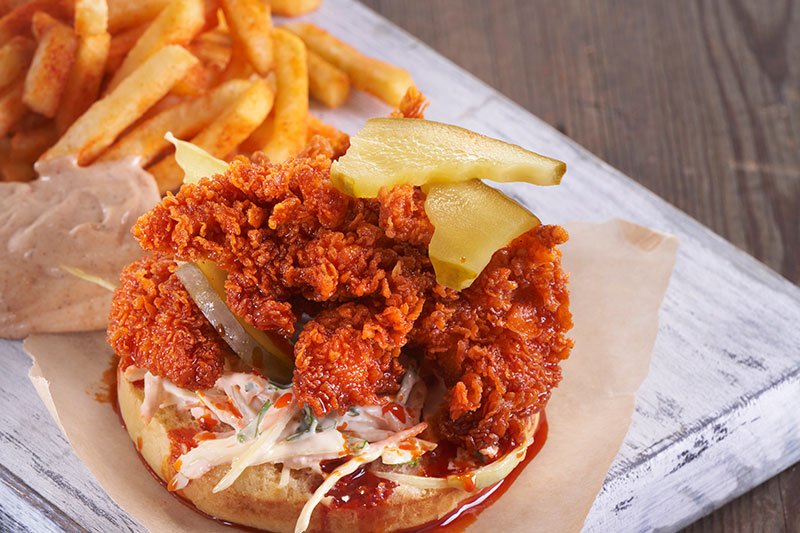 Take a prime tender, soak in B&C Nashville marinade, then double bread in B&C Crispy Nashville Breading, open fry and when cooked, dip in B&C Nashville paprika flavoured warm oil, (At this stage you are thinking fried Chicken dipped in more oil, Boy it works and BOY It`s good) then dust the hot oil drenched Chicken with the Magic B&C Nashville Dust..